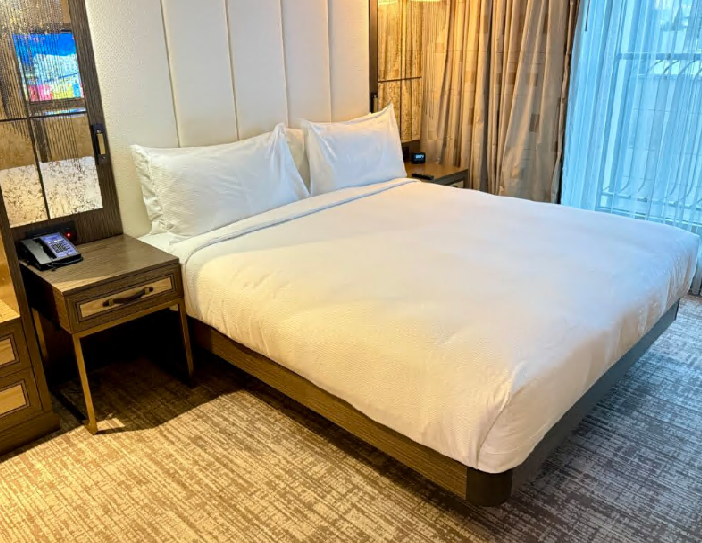 可这烟味实在是败笔。电梯按钮上有淡黄色指印,自助餐厅玻璃隔断映出服务员匆忙擦桌子的背影。套房浴室里,淋浴花洒一开,水汽和烟味在瓷砖墙面上凝结成诡异的水珠。赌场入口霓虹灯夜里特别刺眼,旋转门进出的人带着威士忌味。大堂休息区皮革沙发上有筹码包装纸,行政酒廊落地窗把城市灯光切成菱形光斑,吧台后调酒师摇酒手法熟练得让人心惊。