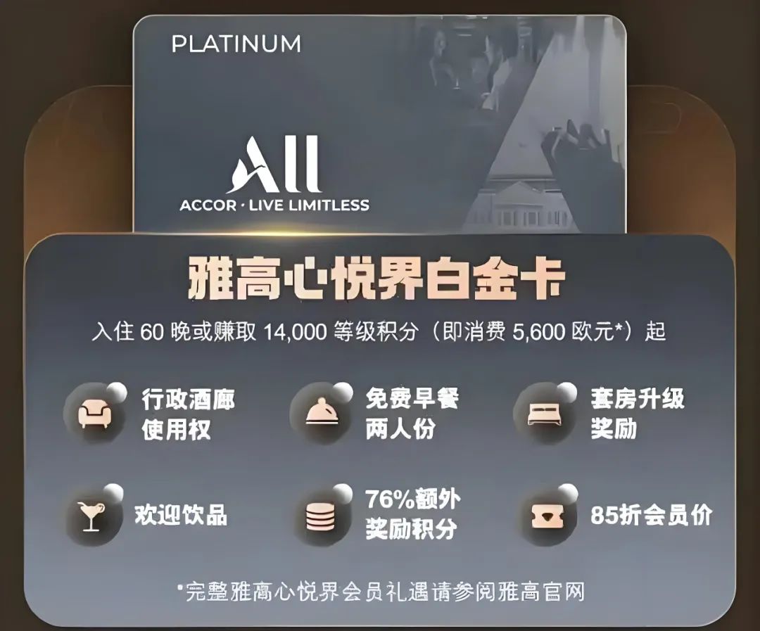 酒廊+双早:东南亚/欧洲酒店待遇厚道,巴黎美憬阁、曼谷索菲特经常给套。(我没写错,楼下早是中国专属,但是酒廊早还是有的啊~) 折扣券包:餐饮7折、房费折扣等,叠加促销时堪比“白嫖”。 备用会籍:万豪、IHG保级失败时的完美Plan B。