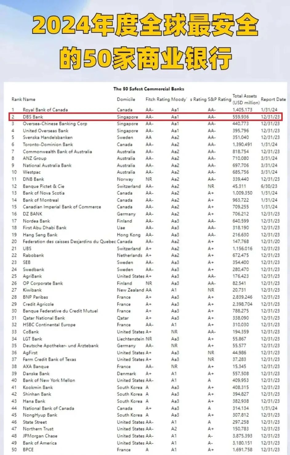 在US金融杂志《环球金融》发布2024年度全球最安全的50家商业银行榜单中,星展银行排在全球第2位。