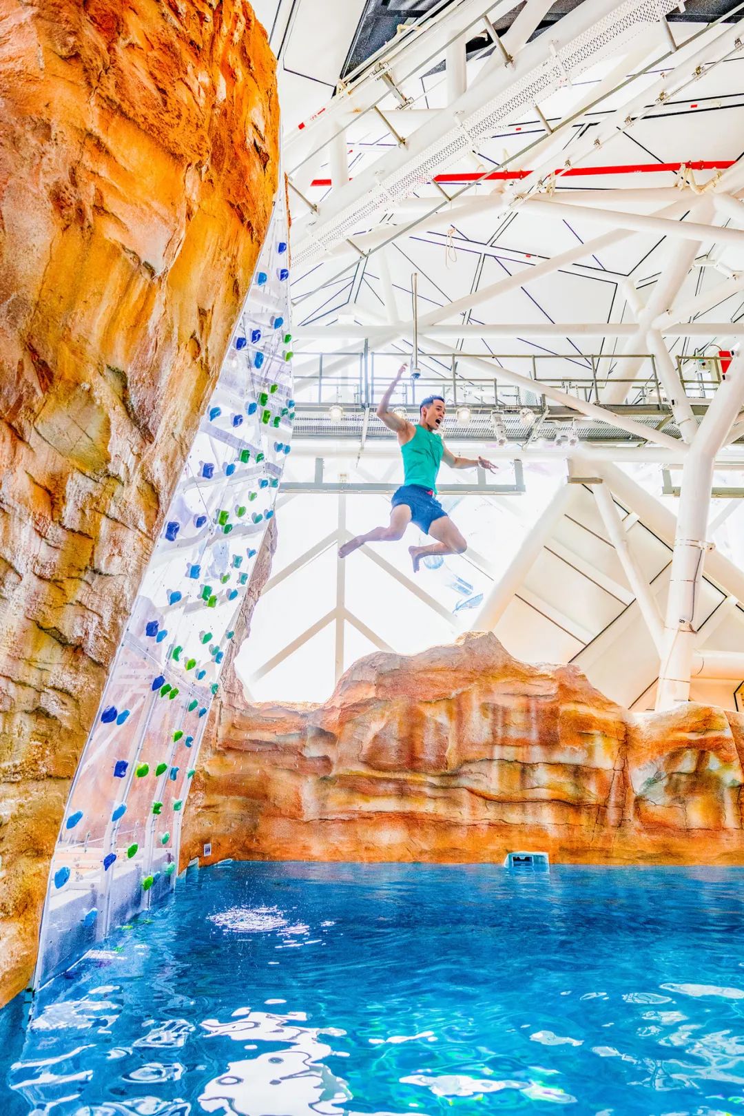 150平方米的深水池深度为四米,可供大胆的勇者挑战平台潜水和水上攀岩活动。