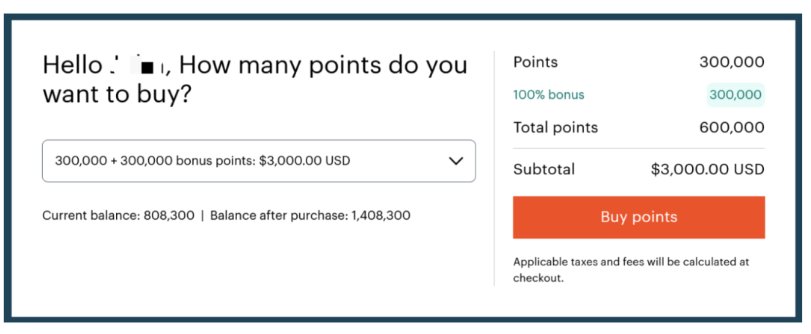 - 加赠比例:购买≥26,000分即享100%额外积分(买1送1)