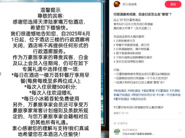 2025年3月,万豪系杭州某万怡酒店一纸公告震动常客圈:行政酒廊永久关闭且无补偿方案。此后新昌万怡、成都万怡等多家酒店接连跟进,掀起酒廊撤裁潮。