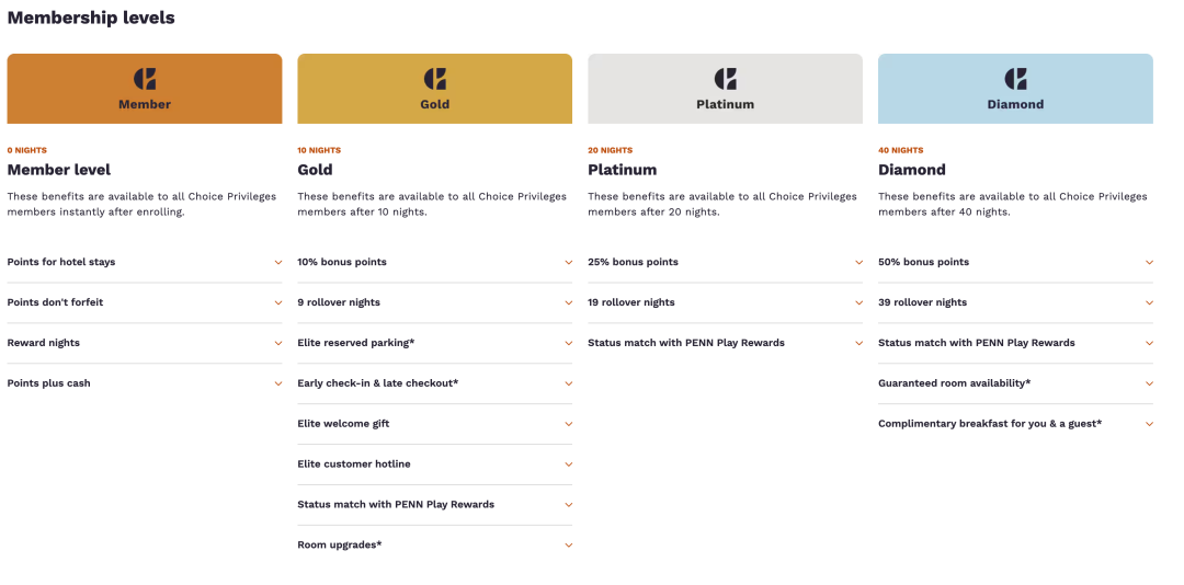 不过,Choice 的会籍权益在实际使用中存在一定限制。例如,仅钻卡会员可享双人早餐,房型升级也仅适用于特定品牌及地区。白金会籍则提供提前入住和延迟退房权益,算是一项较为实用的福利。