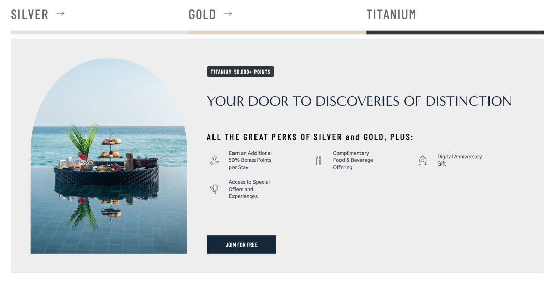 相比之下,璞富腾酒店(Preferred Hotels)的会籍权益更为优越,用户可直接通过匹配获得其最高级别的钛金会籍。