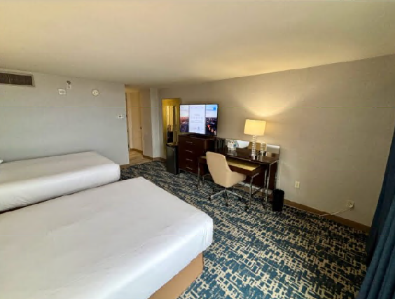 我们住在一个有两张大床的房间里,非常宽敞——比一般的机场酒店房间更宽敞。房间里的家具包括一台大电视、一张办公桌、一把扶手椅和一台迷你冰箱。此外,还有一扇落地窗,可以欣赏机场景色,这在航空爱好者中很受欢迎。话虽如此,房间的装饰感觉有些过时。床头板、地毯和整体色调都表明,虽然酒店进行过一些翻新,但这并非凯悦酒店更现代化的重新设计。不过,房间很干净,一切正常。